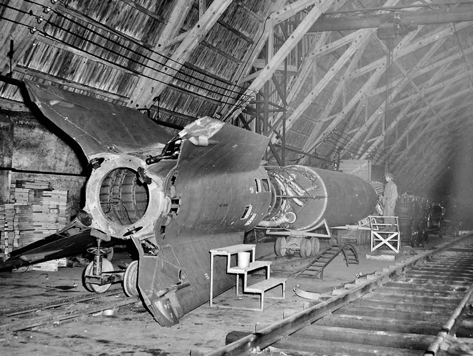 Bir Müttefik askeri Kleinbodungen-Almanya’da tamamlanmamış V-2’yi inceliyor