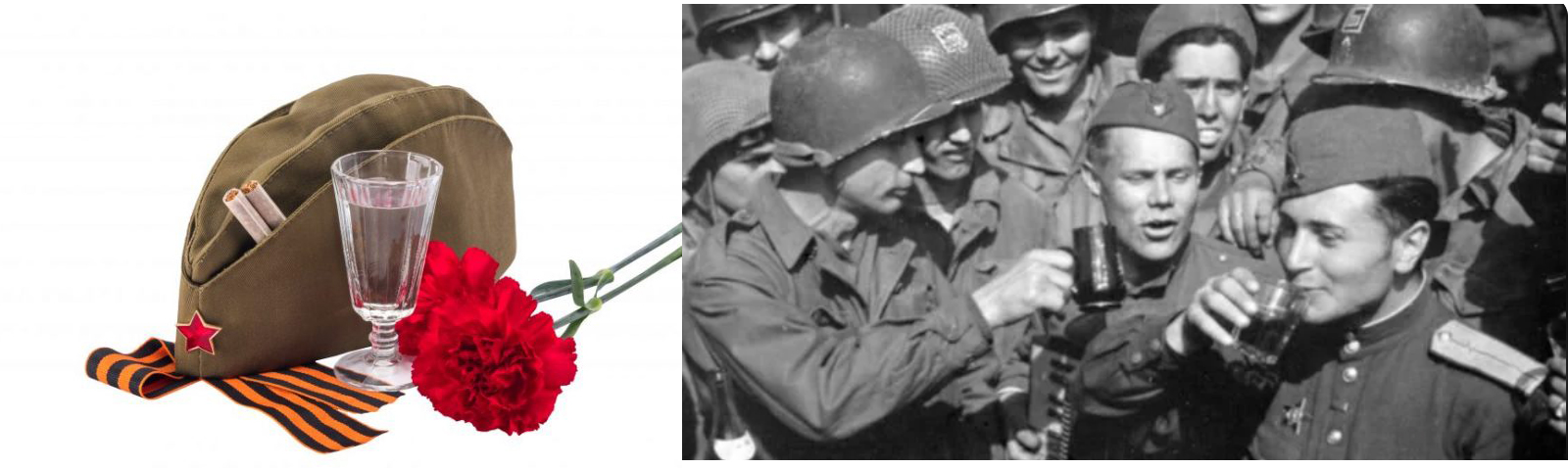 Solda Sovyet savaş sembolleri: Votka, asker kepi, kırmızı karanfil, Aziz George Kurdelesi... Sağda Sovyet ve Amerikalı askerler zaferi içkiyle kutluyorlar,