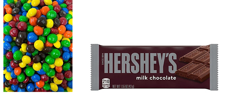 Solda Mars Şirketinin M&Ms şekerlemeleri, sağda klasik Hershey Çikolatası
