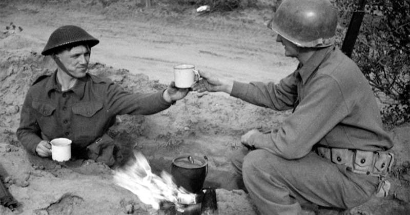 Cephede İngiliz askeri Amerikalı Müttefikine çay sunarken