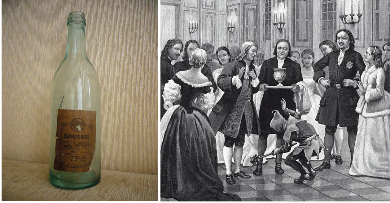 Solda geleneksel votka şişesi (20yy), Sağdaki resim ceza votkası bardağı sunumu