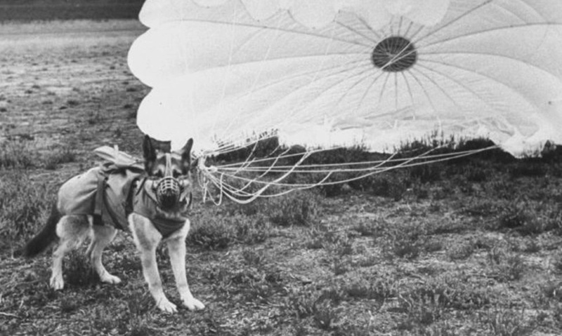 II.Dünya savaşı içinde 66kg ağırlığındaki St. Bernard tipi köpek, özel oksijen maskesi ve paraşüt donanımıyla 7.900m yükseklikten bırakılmıştı. Uçağın hızı 250mph≈ 402km/sa olup yerden ve havadan takip edenler köpek yere değinceye kadar bir tür köpekleme yüzme eylemi gibi davrandığını belirtmişlerdi.