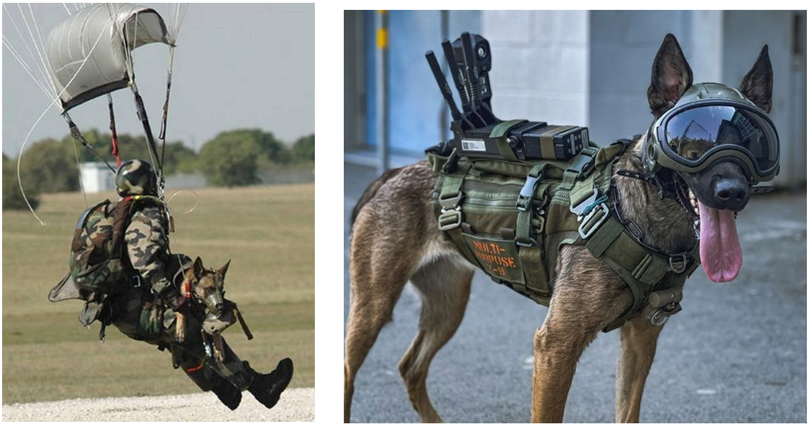 Solda Güney Afrika’da helikopterde atlayışa hazır Alman çoban köpekleri, Sağda ABD ordusunun köpekli tandem paraşütlü indirme birliği