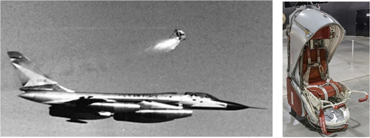 Soldaki resimde ayı Yogi kaçış kapsülüyle B-58’in arka kokpitinden fırlarken, sağda rüzgâr siperliği açık durumdaki kokpit kaçış kapsülü